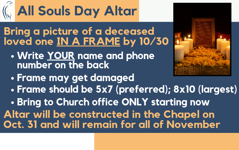 Altar to be set up on 10/31 in the Chapel (location change!) and will remain for the month of November.