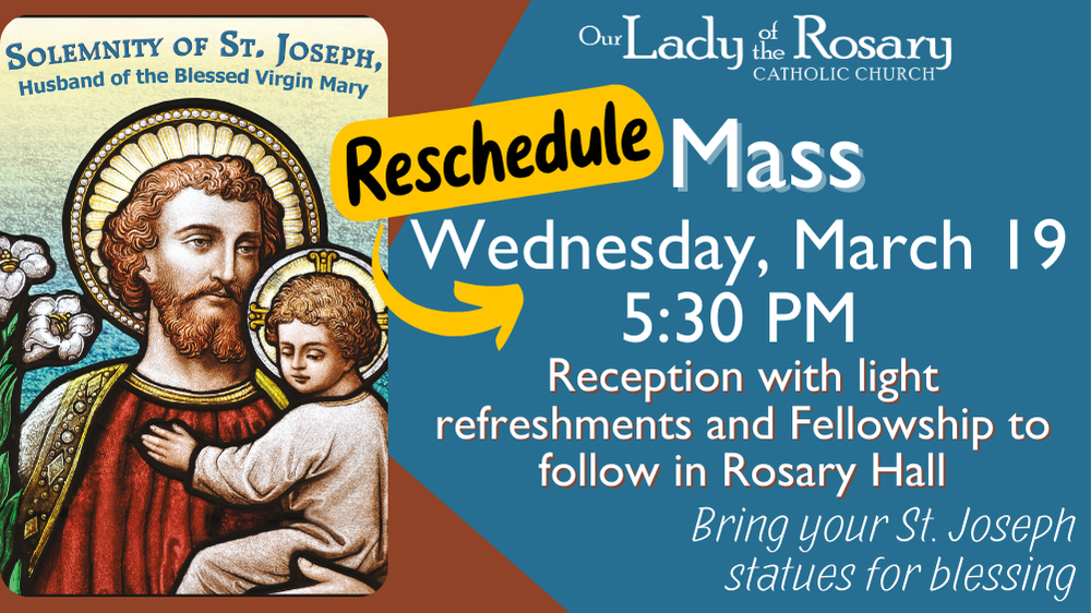 Please join us in celebrating the Feast Day of St. Joseph, Husband of the Blessed Virgin Mary! Wednesday, March 19 5:30 PM Church Reception and Fellowship follows in Rosary Hall *Due to unforseen circumstances, the 2025 St. Joseph Mass has been changed to Wednesday, March 19 at 5:30PM and the Feast/Table has been cancelled. There will still be light refreshments (cookies/coffee) and fellowship following the Mass in Rosary Hall.